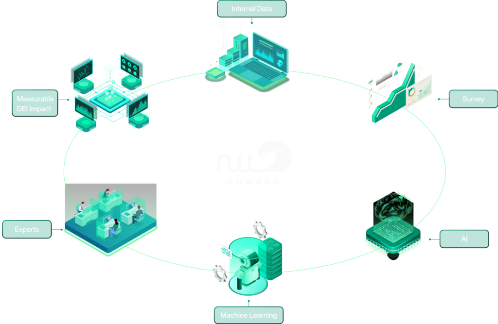 nuLogic, our AI technology platform works as a central spoke to various factors that contribute to impactful culture change. We combine your internal data, our curated survey, cutting edge technologies like Artificial Intelligence and Machine Learning, and our team of interdisciplinary experts to create a cost effective, measurable, scalable, DEI culture change engine that ties directly to organizational outcomes and financial impact. Making the right thing, and the profitable thing, easy to do.
